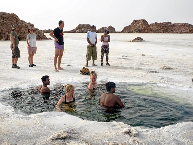 Visit Lake Afrera (Lake Giuletti), a hypersaline lake fed by underground streams. Explore the unique surroundings and relax. Overnight in hotel/camping.